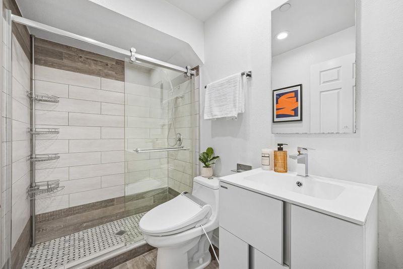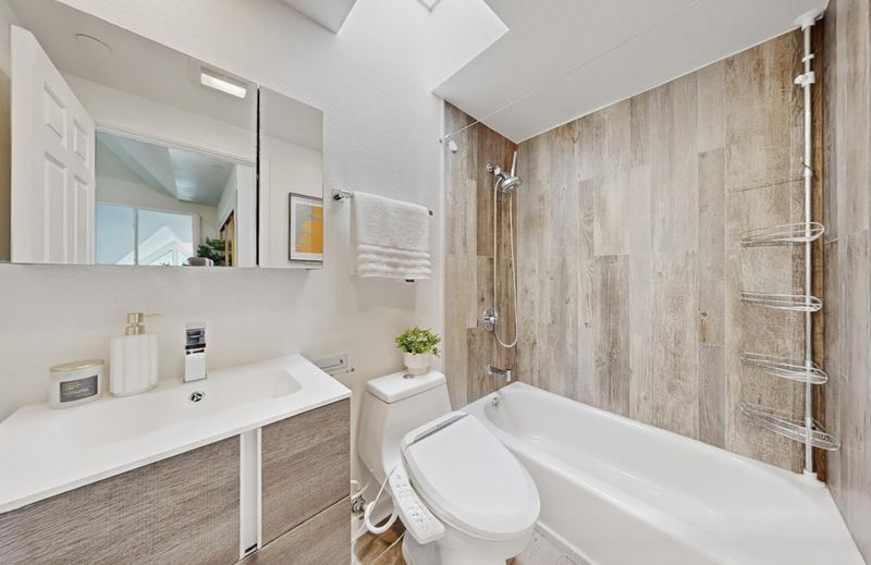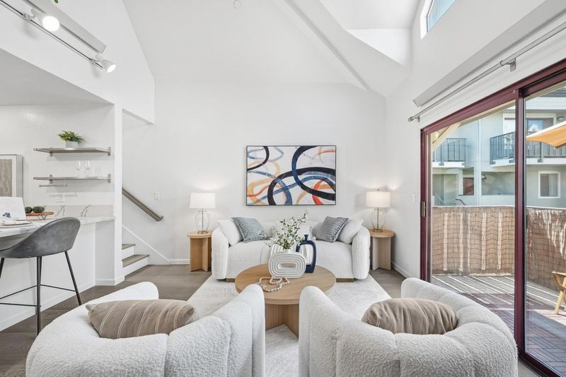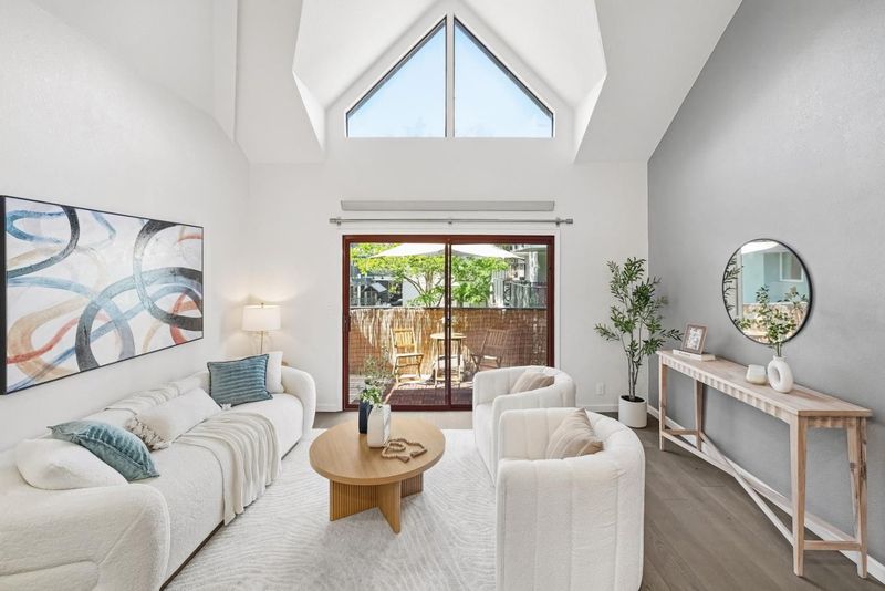 Welcome to this prime end-unit condo with 2 beds and 2 baths in the heart of Palo Alto, set within a gated community. This two-story home offers a thoughtful layout, starting with a spacious lower-level bedroom and a nearby full bath featuring a floating vanity and a sleek stall shower. Down the hall, the cozy kitchen includes quartz countertops, a stylish backsplash, stainless steel appliances, and a breakfast bar. The bright living room boasts a vaulted ceiling and large windows, filling the space with natural light. A sliding door opens to a private balcony-perfect for relaxing outdoors. Upstairs, the primary suite features a bedroom with a vaulted ceiling and an en-suite bath with a shower over tub and skylight, plus direct access to an upper-level balcony. A washer and dryer on the same level add everyday convenience. Additional highlights include engineered hardwood flooring, double-pane windows, and recessed lighting throughout. The home comes with two assigned parking spaces and extra storage in an underground garage. Ideally located near downtown, shops, and restaurants, and within the top-rated Palo Alto school district. Do not miss this great opportunity!